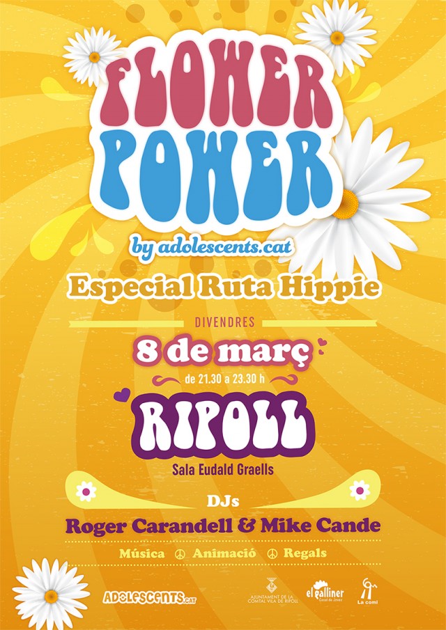 Sala Eudald Graells de 21.30h a 23.30h celebrant una Flower Power molt especial, ja que es troba dins el marc d'actes de la famosa Ruta Hippie de Ripoll.