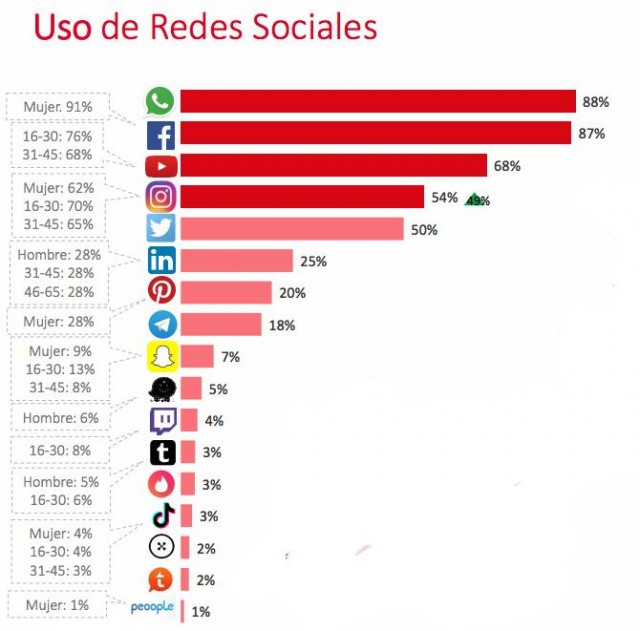 WhatsApp, YouTube, Instagram i Facebook són les plataformes amb més èxit a l'estat espanyol. Un 85% de la població les utilitza i molts d'ells ho fan de manera diària,