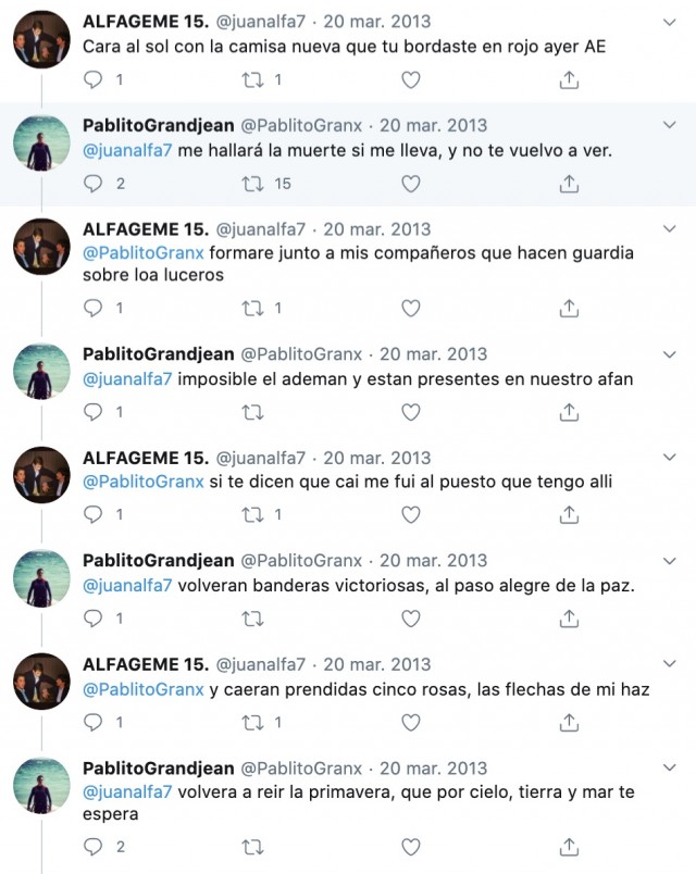 "Arriba España" i "Puto tito, vaya cacho de gay". A més a més, havia compartit tuits amb la cançó franquista Cara al Sol i altres on s'hi podia llegir: "Los me gustan son proporcionales a lo guarras que seais", entre altres.
