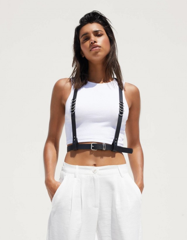 Aquest és el cas de Bershka que ha sorprès els usuaris amb un complement força peculiar: un arnès-armilla de color negre.