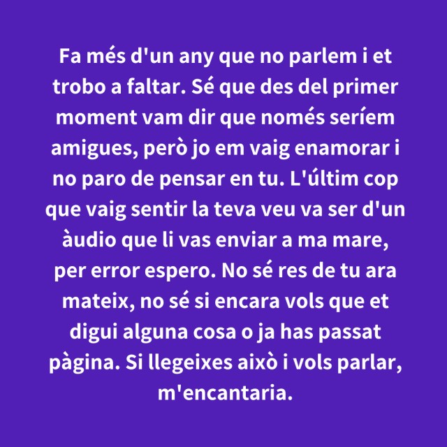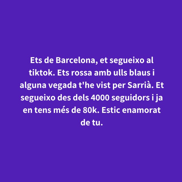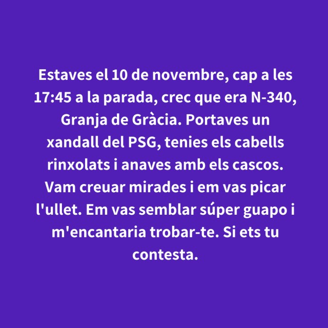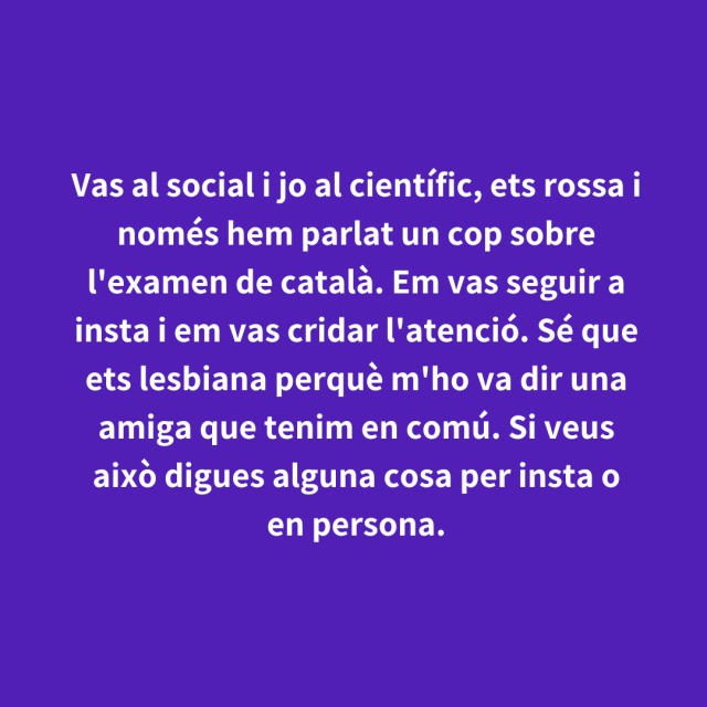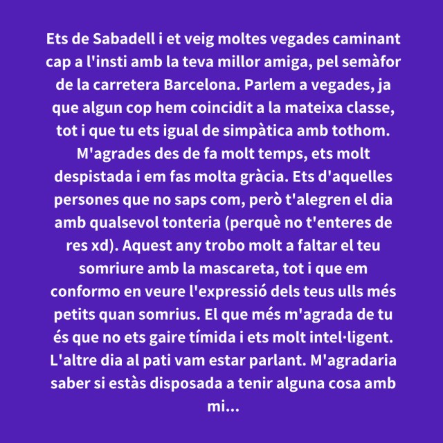 us proposem fer arribar aquestes indirectes als vostres «crush». Potser és algú que coneixes i va al mateix institut que tu, però un «crush» pot ser aquella persona amb qui vas coincidir a la cua d'un McDonald's, us vau mirar, us vau somriure, però no us vau dir res. I ara, clar, necessites saber qui és!