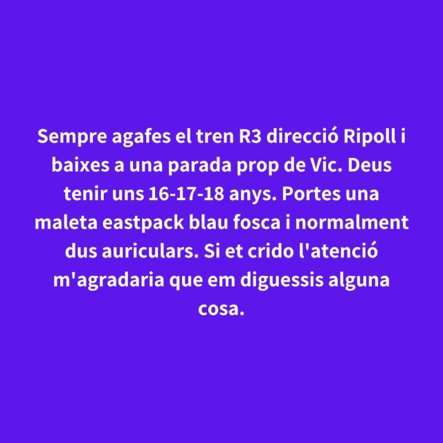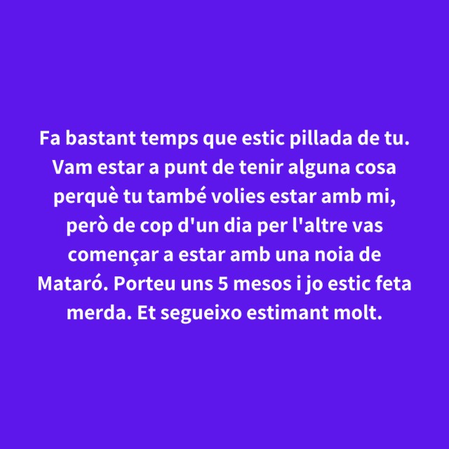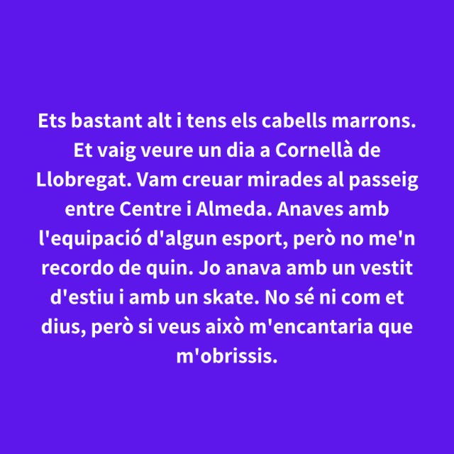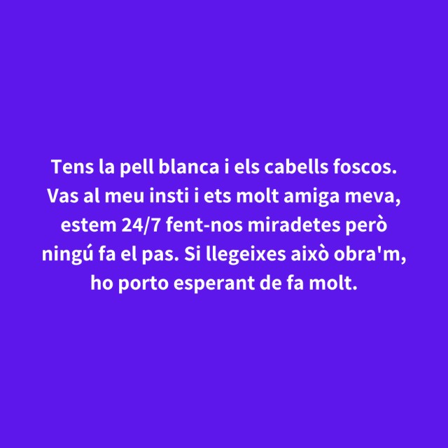 us proposem fer arribar aquestes indirectes als vostres «crush». Potser és algú que coneixes i va al mateix institut que tu, però un «crush» pot ser aquella persona amb qui vas coincidir a la cua d'un McDonald's, us vau mirar, us vau somriure, però no us vau dir res. I ara, clar, necessites saber qui és!