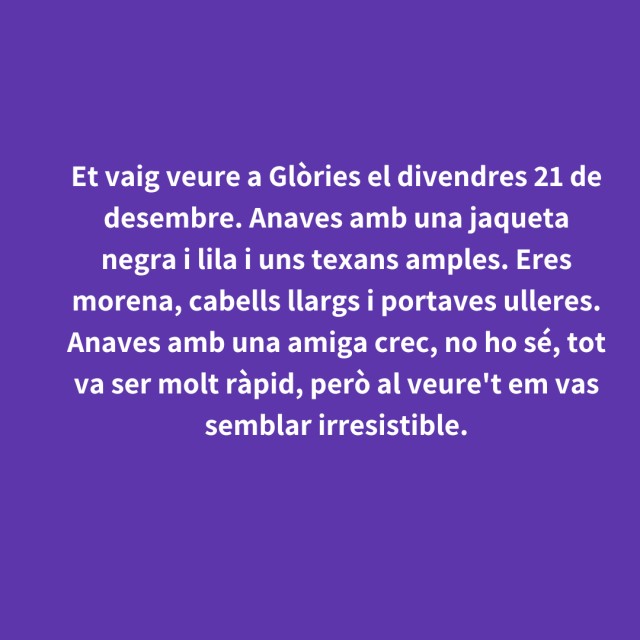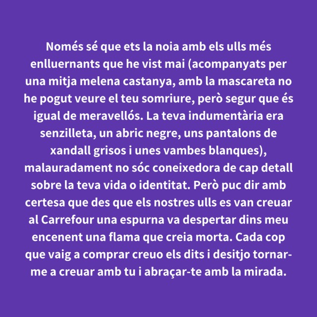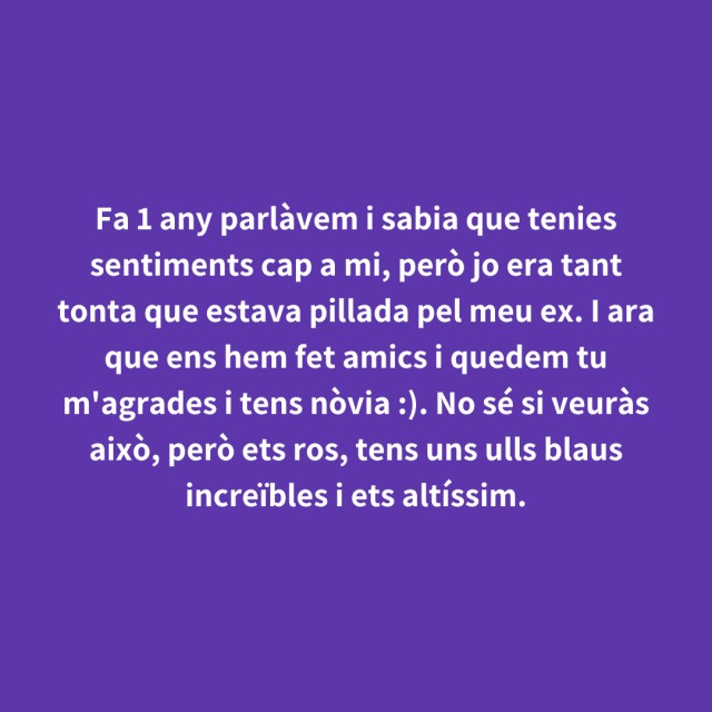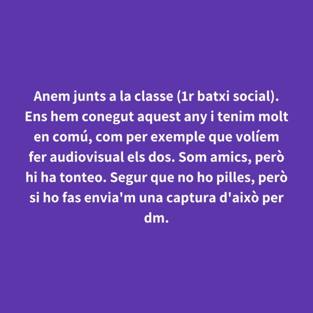 us proposem fer arribar aquestes indirectes als vostres «crush». Potser és algú que coneixes i va al mateix institut que tu, però un «crush» pot ser aquella persona amb qui vas coincidir a la cua d'un McDonald's, us vau mirar, us vau somriure, però no us vau dir res. I ara, clar, necessites saber qui és!