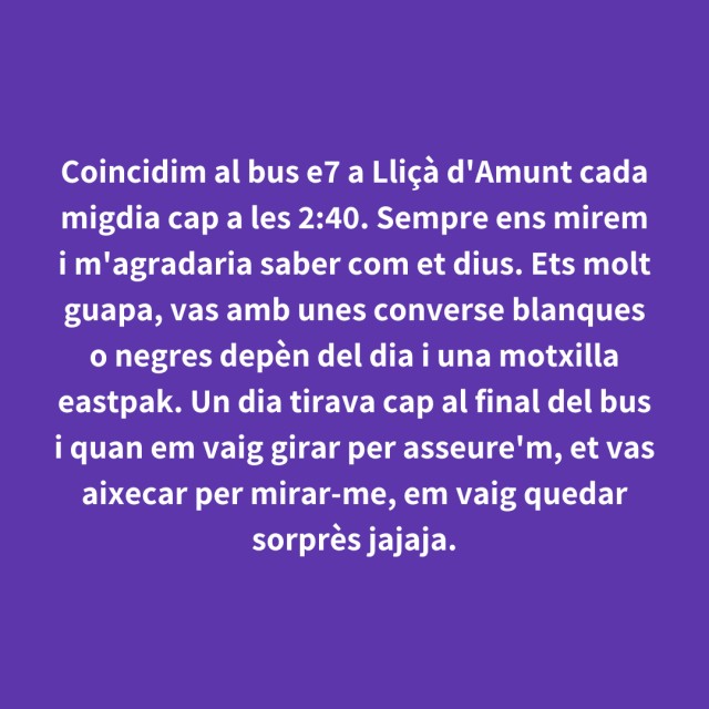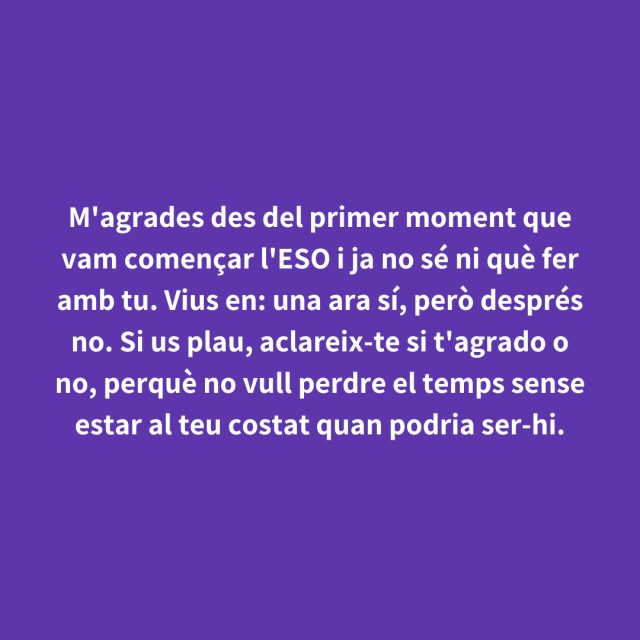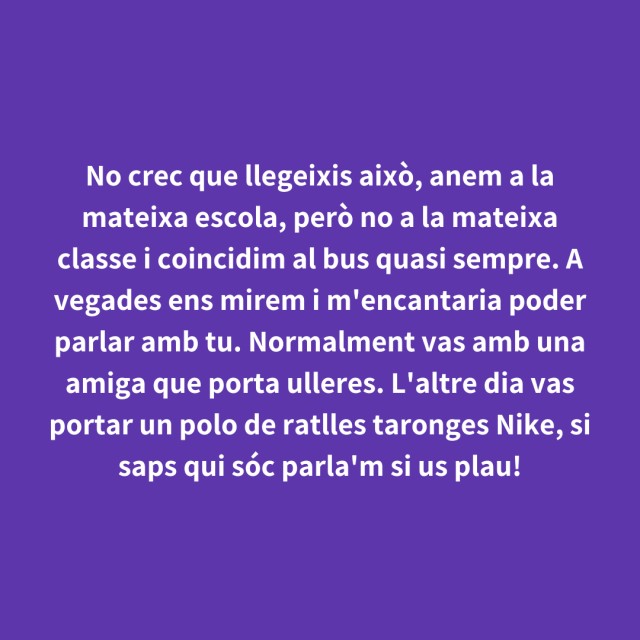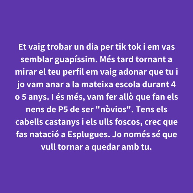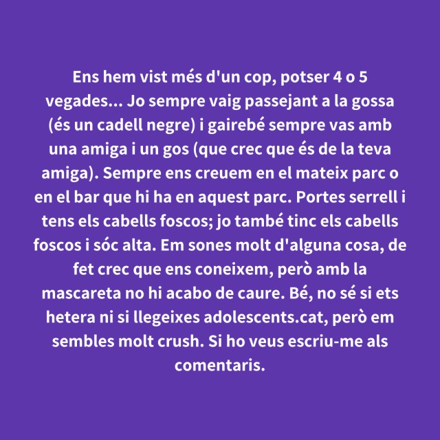 us proposem fer arribar aquestes indirectes als vostres «crush». Potser és algú que coneixes i va al mateix institut que tu, però un «crush» pot ser aquella persona amb qui vas coincidir a la cua d'un McDonald's, us vau mirar, us vau somriure, però no us vau dir res. I ara, clar, necessites saber qui és!