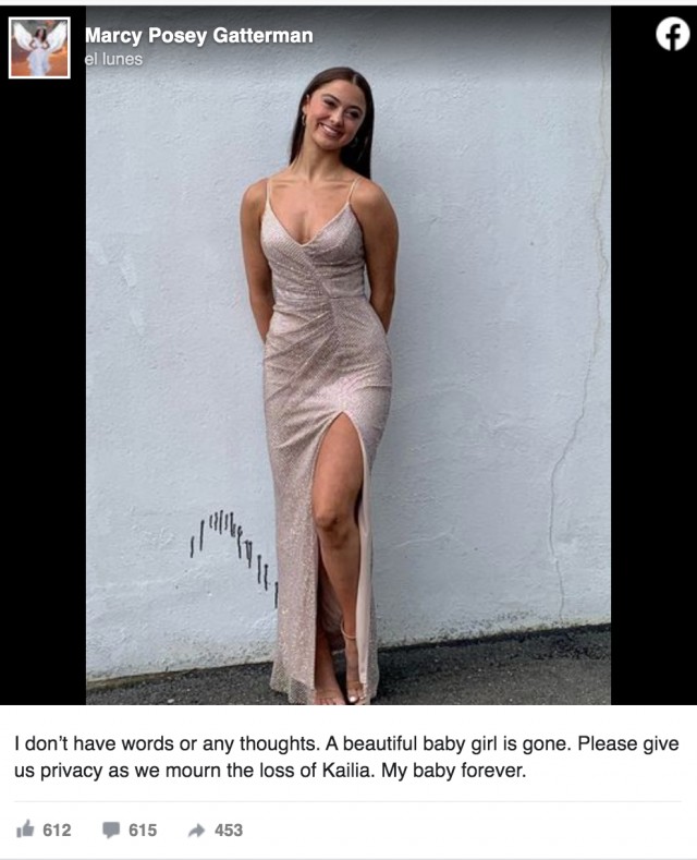 Ha estat la seva pròpia mare, Marcy Posey Gatterman, qui ha compartit la trista notícia a través de les xarxes socials, al costat d'una foto de la Kailia. "No tinc paraules.