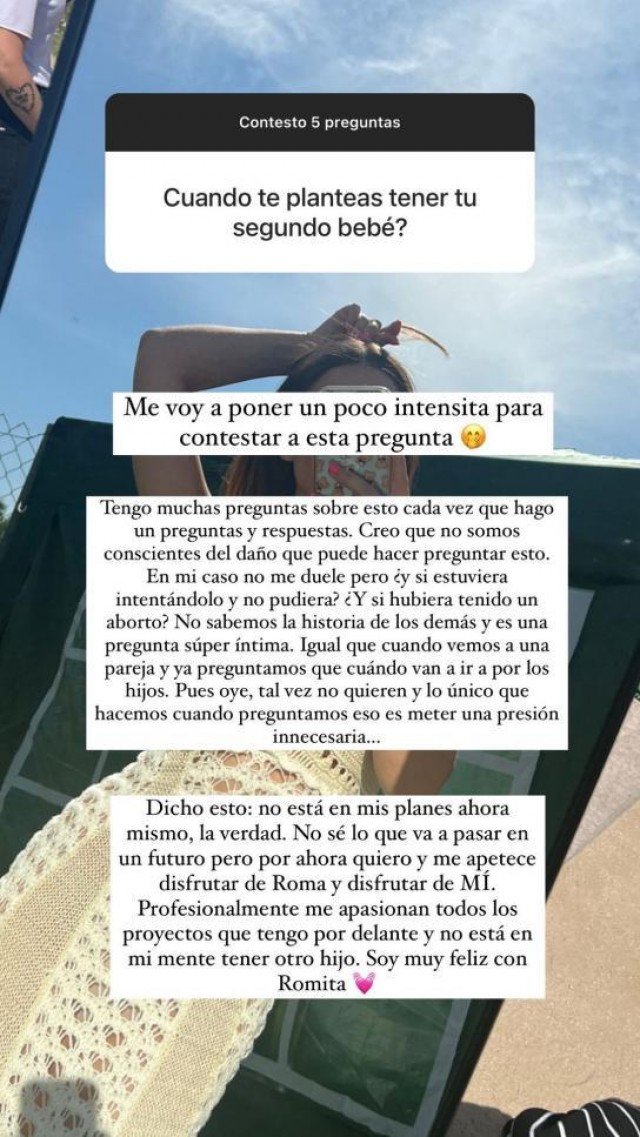 "Dit això: no entra en els meus plans ara mateix, la veritat. No sé el que passarà en un futur, però ara com ara el que vull i em ve de gust és gaudir de la Roma i gaudir de mi. Professionalment, m'apassionen tots els projectes que tinc i no tinc pensat tenir un altre fill. Soc molt feliç amb la Romita".