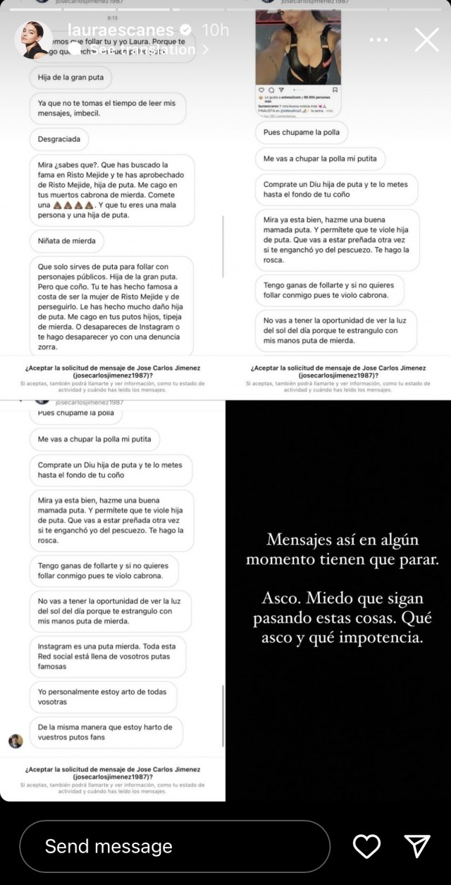 Però no tot és bo, sinó que diàriament ha d'aguantar missatges d'odi i recentment ha decidit compartir amb els seus seguidors uns missatges que rep des de fa temps a través d'Instagram per part de l'usuari @josecarlosjimenez1987. Podem llegir frases com