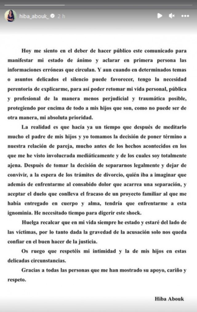 "Avui em sento al deure de fer públic aquest comunicat per manifestar el meu estat d'ànim i aclarir en primera persona les informacions errònies que circulen", ha començat dient l'actriu. Seguidament ha procedit a aclarir totes les notícies que l'han rodejat en l'últim mes, aclarint que quan es tracta d'assumptes delicats a vegades mantenir silenci és el millor que es pot fer.