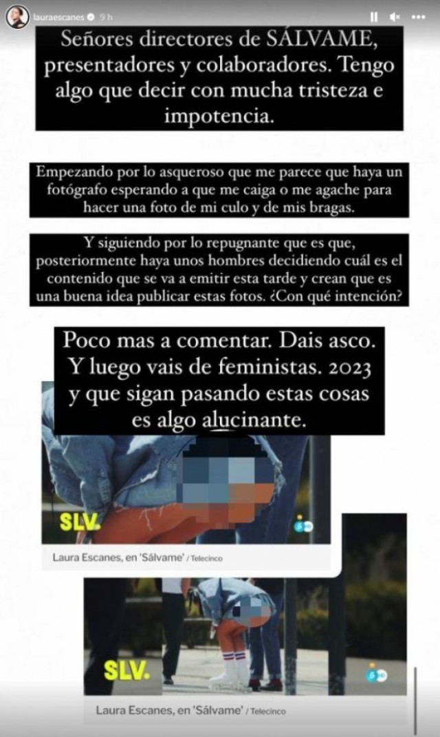 "Senyors directors de Sálvame, presentadors i col·laboradors. Tinc coses a dir amb molta tristesa i impotència. Començant pel fastigós que em sembla que hi hagi un fotògraf esperant que caigui o m'ajupi per a fer una foto del meu cul i de les meves calces.