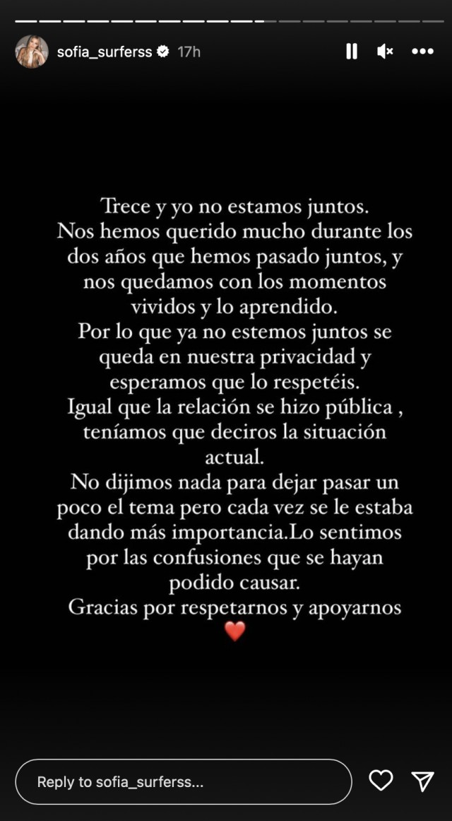 Pel que ja no estem junts es queda en la nostra privacitat i esperem que ho respecteu. Igual que la relació es va fer pública, havíem de dir-vos la situació actual", comença dient la story que ha publicat la