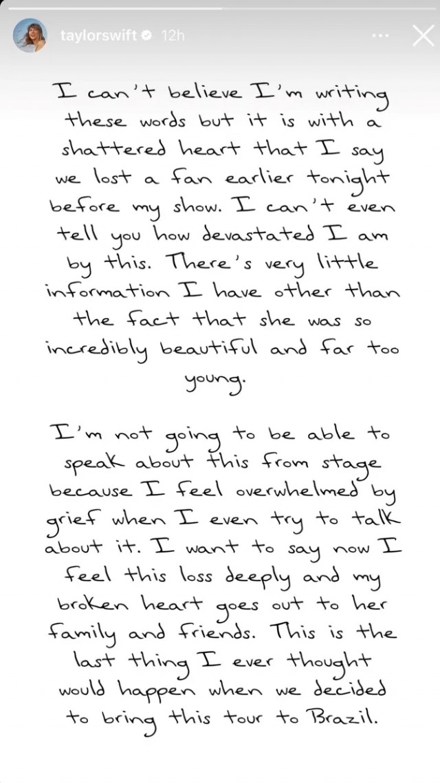Quan Taylor Swift va assabentar-se del que havia passat, va publicar un escrit a les seves xarxes socials. Assegurava que està devastada, que és l'última cosa que esperava que passés quan va decidir portar la seva gira al Brasil i que no serà capaç de parlar sobre el tema dalt l'escenari perquè se sent "aclaparada" per la pena.