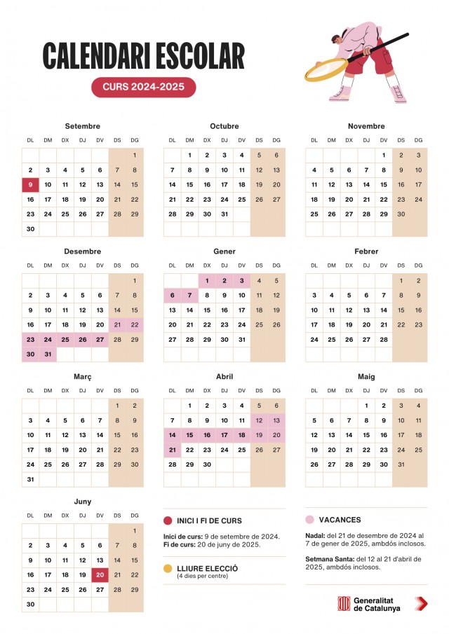 Aquest dilluns 9 de setembre comença el curs escolar 2024/2025 a primària i l’ESO. El dijous 12 de setembre ja serà el torn per als alumnes de batxillerat i FP. Sembla, ara sí, que les vacances d’estiu ja s’han acabat, però perquè els ànims no decaiguin, us deixem el calendari d’aquest curs escolar amb les dates més importants: inici i final, festius i les vacances.