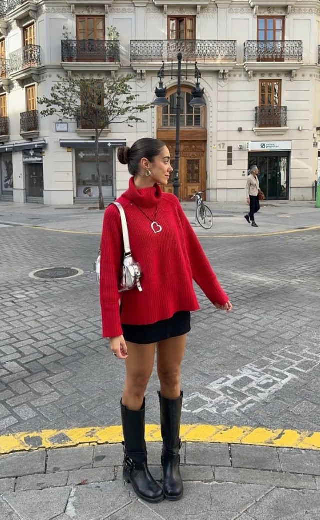 - Mini faldilla de cuir negre amb mitges transparents i un jersei de llana oversize vermell.