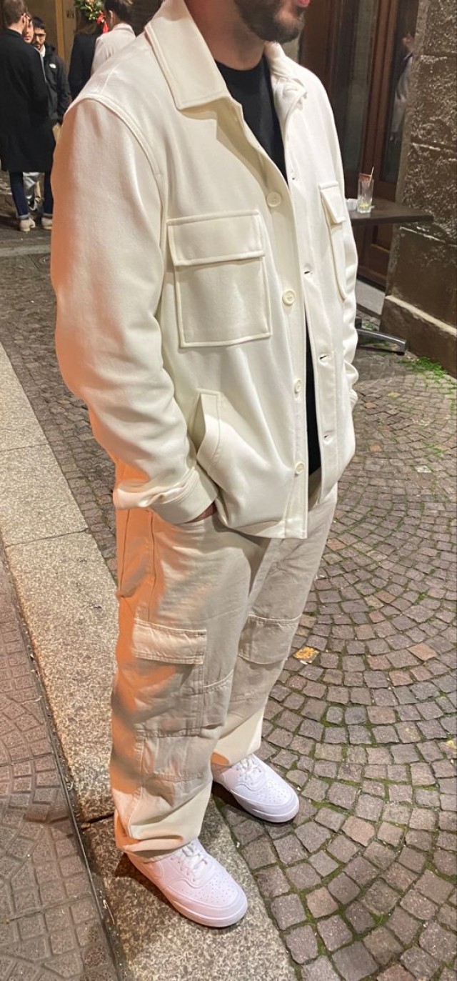 - Un conjunt de pantalons i jersei de punt en tons crema o blanc trencat.