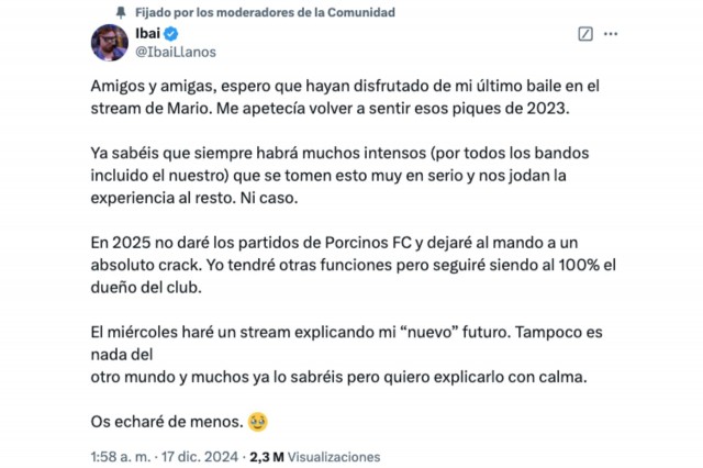 Concretament, l’streamer basc ha anunciat que deixarà de retransmetre i comentar els partits del seu club en directe a partir del 2025. Tot i això, ha matisat que es manté com el propietari únic i total de Porcinos FC, però que delegarà la reacció en directe als partits a “un absolut crac”, tot i que no ha detallat qui serà. Tampoc no ha volgut explicar quin serà doncs el seu rol dins del seu equip: “Tindré altres funcions”, ha explicat.