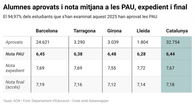 A Barcelona ha aprovat 24,621 alumnes, amb una mitjana de 6,454 i una nota mitjana d’accés de 7,192. En el cas de Girona, han aprovat 3.039 estudiants, amb una mitjana de 6,481 i d’accés de 7,121. A Lleida han aprovat 1.804 alumnes, amb una mitjana de 6,286 i d’accés de 7,144.