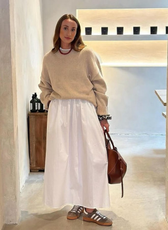 Senzilla però amb molt de joc, la faldilla blanca és una base neutra que pots reinventar cada dia. Amb jerseis fins, amb americanes de colors o fins i tot amb botes cowboy, es converteix en el llenç en blanc on projectar el teu estil personal.